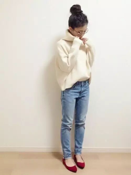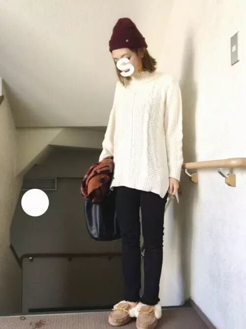 温暖的白色针织上一和温暖的平底鞋上的白毛,让搭配也生出可爱温暖的感觉。